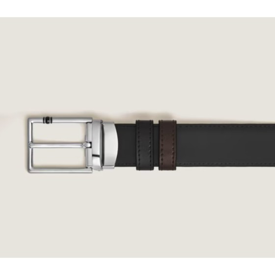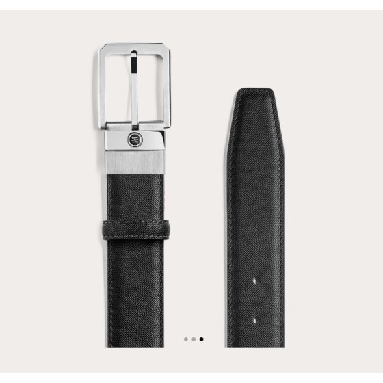 Fibbia ad ardiglione a ferro di cavallo in acciaio pregiato lucido con emblema Montblanc. Cinghia in pelle reversibile nera e...