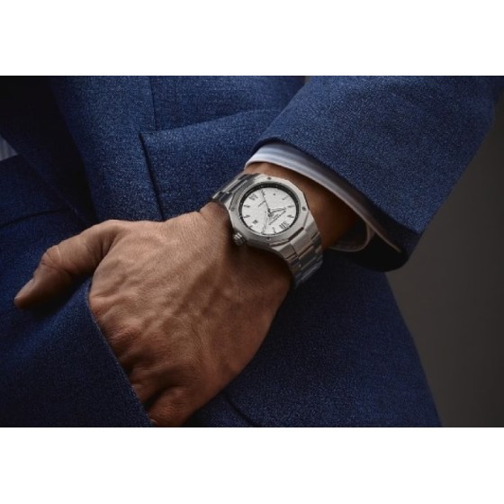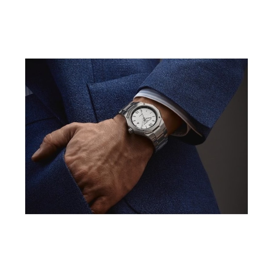 Dedicato ai momenti personali, il Riviera 42 mm 10829 rivela in modo eloquente la percezione del tempo di chi lo indossa. Quest'uomo si sente padrone del suo tempo e della sua vita. Sicuro di sé, sa cosa vuole e cosa si aspetta dall'orologio che ha scelto per accompagnarlo in ogni momento della sua vita. È sicuro della sua scelta perché punta sull'affidabilità e sulla buona fattura; sul patrimonio di una Maison la cui eccellenza orologiera si perpetua da quasi 200 anni. Il quadrante in bianco e nero, in stile anni '50, evoca l'equilibrio, l'armonia e la bellezza dei contrasti della vita. Il ritmo di questo segnatempo mette alla prova chi lo indossa, che accetta la sfida, conquistato dal suo irresistibile brio.